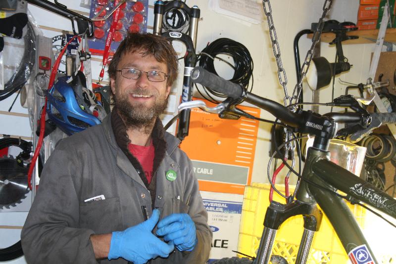 Philippe répare les vélos. Avant d’être mécanicien, il est avant tout un artiste. Ça se voit juste à regarder la facade de sa boutique où l’on apperçoit entre autres des vélos sur la toiture ainsi que plusieurs murs de roues. La court arrière ressemble à un chaos organisé de ferrail. On y retrouve entre autres des vélos mauves qu’il loue pour presque rien, un autobus jaune qui sert d’entrepôt et des pièces de tout genre ici et là. Dans la boutique elle-même, des scultures kinétiques sont cachés dernières les items à vendre. “Je les ai déjà exposé au Yukon Art Center”, nous dit-il fièrement. Son art n’est pas un passe-temps; c’est un nécessité. Avant de s’intaller à Whitehorse, il déplaçait son atelier mobile à travers les villages du Yukon. Il est très implique avec le Parti Vert. Il est aussi acteur à ses heures ; il a déjà joué un conspirateur dans une pièce de Jules César au théâre.