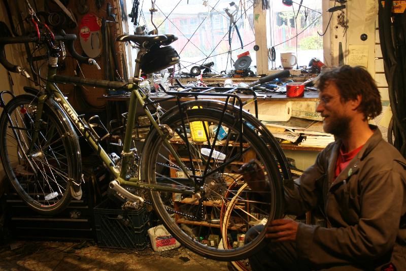 Philippe répare les vélos. Avant d’être mécanicien, il est avant tout un artiste. Ça se voit juste à regarder la facade de sa boutique où l’on apperçoit entre autres des vélos sur la toiture ainsi que plusieurs murs de roues. La court arrière ressemble à un chaos organisé de ferrail. On y retrouve entre autres des vélos mauves qu’il loue pour presque rien, un autobus jaune qui sert d’entrepôt et des pièces de tout genre ici et là. Dans la boutique elle-même, des scultures kinétiques sont cachés dernières les items à vendre. “Je les ai déjà exposé au Yukon Art Center”, nous dit-il fièrement. Son art n’est pas un passe-temps; c’est un nécessité. Avant de s’intaller à Whitehorse, il déplaçait son atelier mobile à travers les villages du Yukon. Il est très implique avec le Parti Vert. Il est aussi acteur à ses heures ; il a déjà joué un conspirateur dans une pièce de Jules César au théâre.