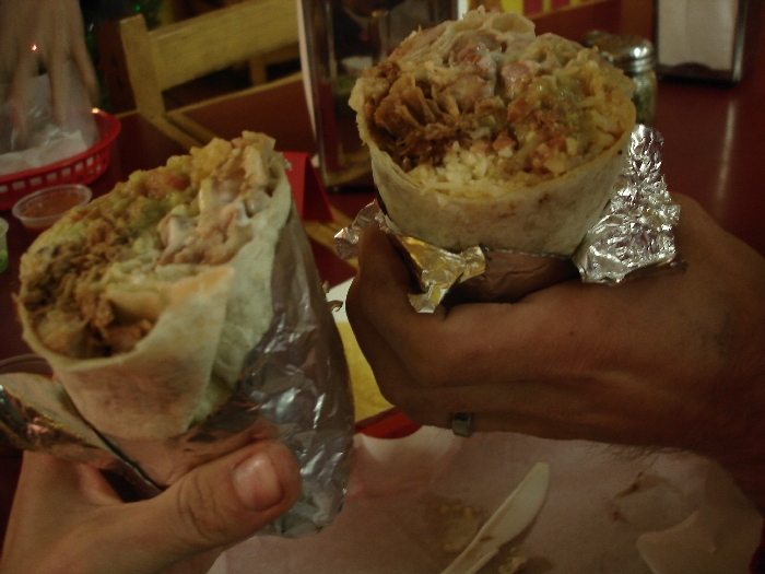 After some fierce gesturing, deadpan earnestness, half-truths and veiled threats, we were on a train under the Bay. We popped out at West Oakland Station, and were met by Simon, old friend, ex-messenger, one-time Montreal flatmate and international man of mystery. After perhaps the sketchiest ride of my life along the shoulderless speedways of the East Bay’s industrial wasteland in the dark, we finally got unloaded in Simon’s storefront apartment in Fruitvale (sounds more… um… bountiful than it is). Our gracious host then led us to the taqueria (Mexican fast food restaurant) of our dreams. We were famished; riding into a big city really screws up our snacking system, as it always takes longer than seems possible and there’s rarely a good place to pull over and make a sandwich. The $6 “super burrito” weighed about 3 pounds – I kid you not. Lucie made hers disappear in about 6 minutes and had a stomach ache for four days. I opted for a doggy bag.