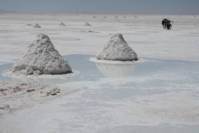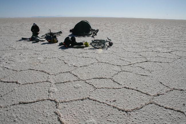 L’arrivée à la frontière du Salar est émouvant, surtout après autant d’effort. Nous nous sommes amusés comme des fous lors d’une séance photos qui permet de faire des effets cocasses en l’absence de perspective. Le soir, nous avons campé directement sur le sel à quelques kilomètres de l’île Incahuasi au centre de le l’ancien lac. Des vents violents avec rafales à plus de 100 km/heure se sont mis de la partie au moment de lancer la tente. Nous avons tenté de la stabiliser avec des piquets (pas facile de les insérer dans le sel!), mais nos vélos se sont avérés être un encrage plus efficace. La tempête prenait de l’ampleur au fur et à mesure que les derniers rayons du soleil fuyaient pour laisser place à un froid glacial. Le plus stressant est une fois couché, quand tout ce qu’il reste à faire est d’écouter les vents fouetter la tente de tous bords, tous côtés. « Et si la tente déchirait, et si elle s’envolait… » Torrey et moi tentions d’élaborer un plan B en vain en regardant les pôles plier. Cette nuit compte parmi les trois plus stressantes depuis que nous avons quitté Montréal.